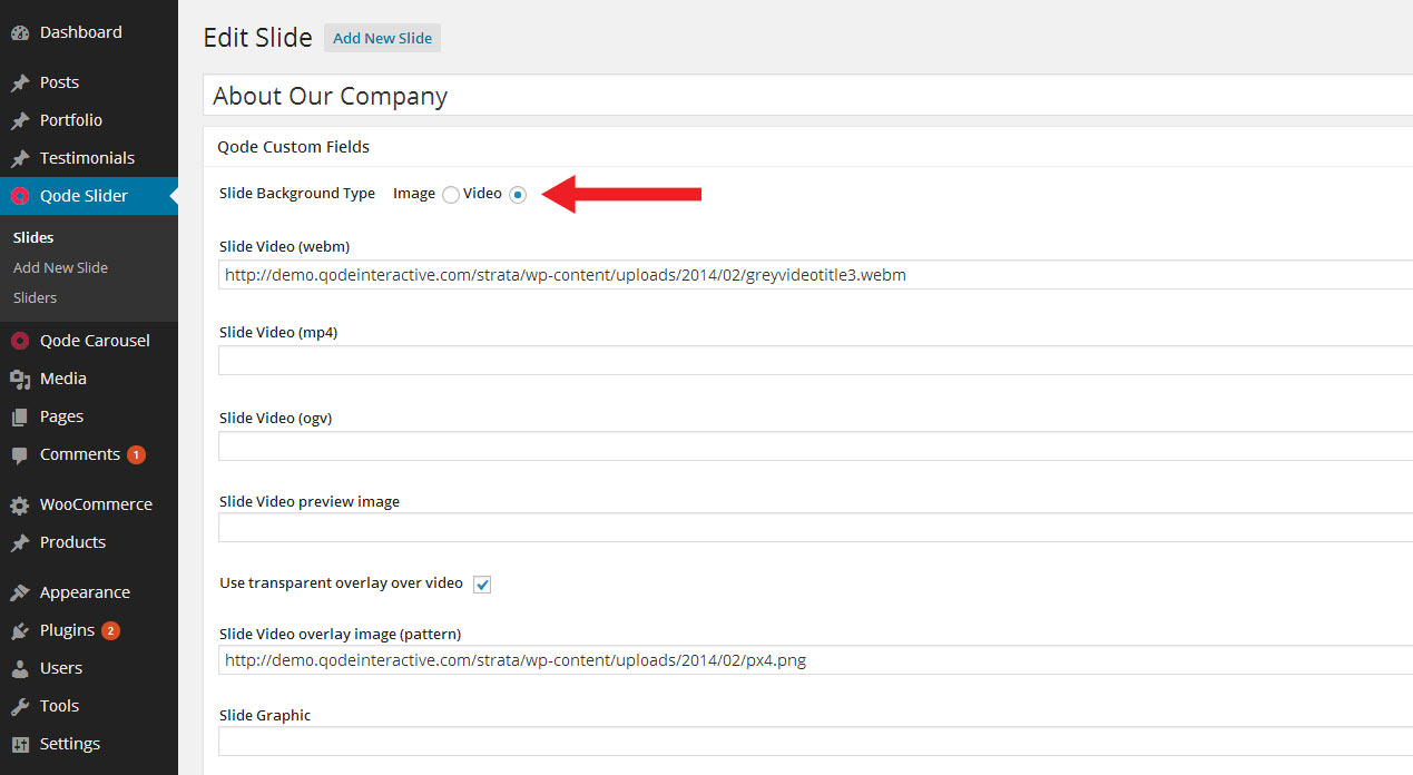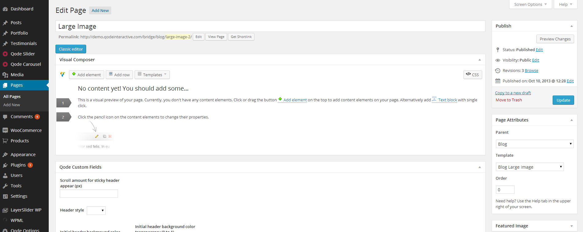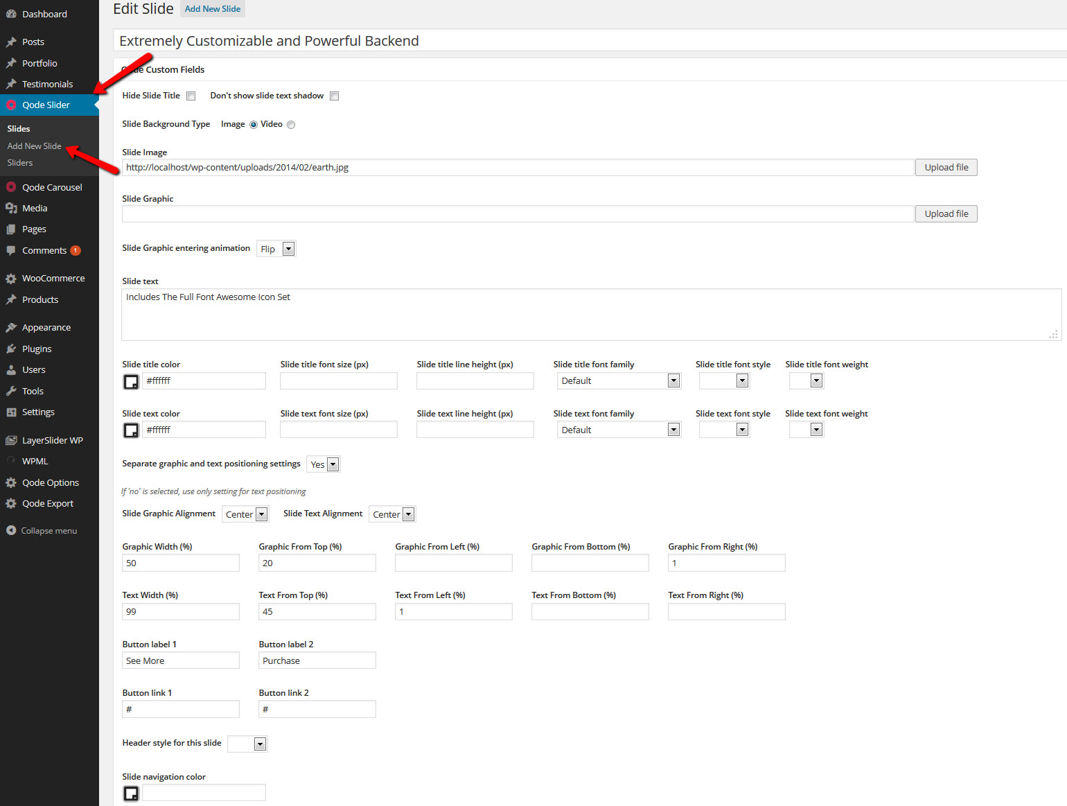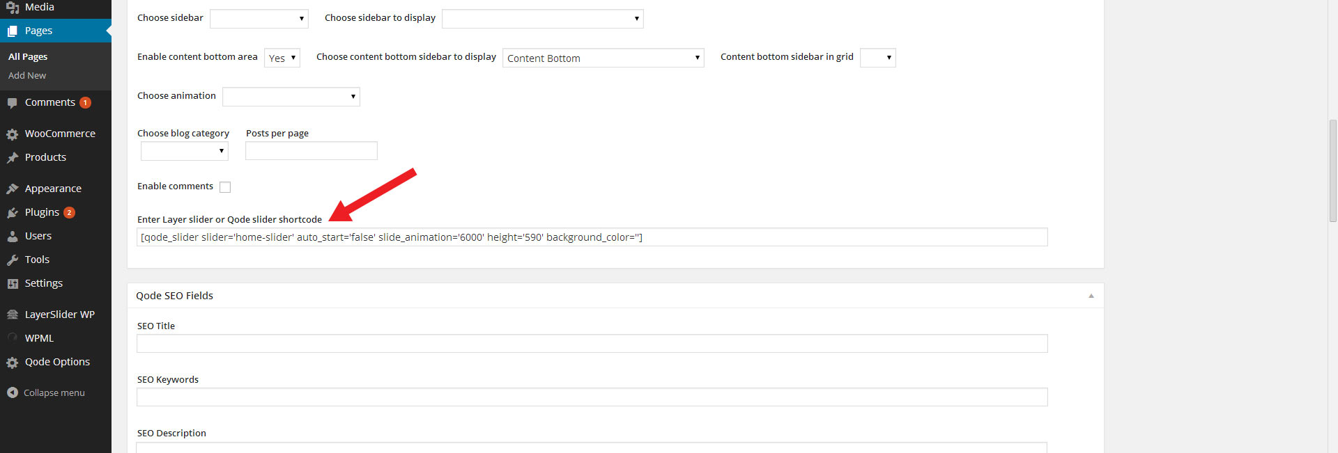 Access the “Qode Options” in the left menu. Some of these options may be overridden locally, in the shortcode or page settings (e.g. text color in editor or page title layout in the Qode Custom Fields while editing post/page/portfolio item).