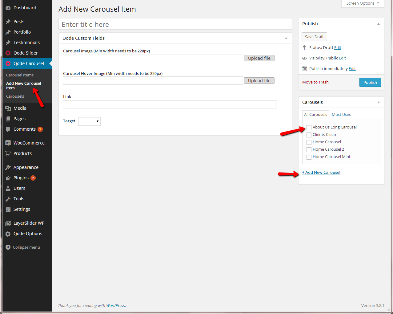 Add New Carousel Item - Click here to add your first carousel item. First you need to upload some image for your carousel item. Find Carousel Image field and upload your image. Also you can upload hover image for this Carousel item, just findCarousel Hover Image field and click upload. Minimal width for image size is 220px.