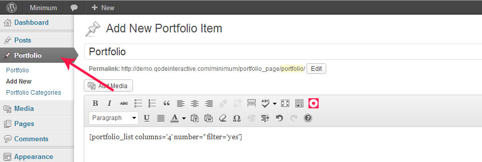 See the new Portfolio post type in the left WordPress menu. In order to create a portfolio page, create a new page and enter the Portfolio List shortcode from the Q dropdown menu in editor (e.g. [portfolio_list columns="4" filter="yes"]). This will generate a portfolio list page which will be empty if there are no Portfolio projects added.