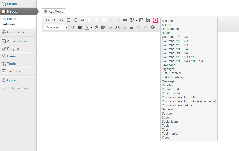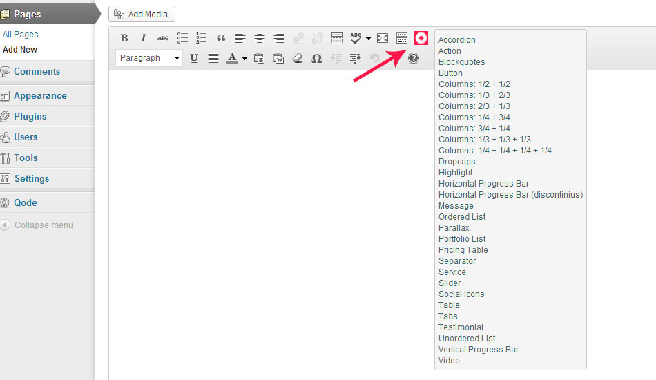 Pages/Posts are built using shortcodes accessed by clicking “Qode shortcodes” icon in the top right of the TinyMCE editor. All shortcodes are in the drop down menu listed alphabetically.