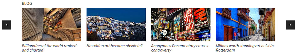 Slider “Small2” is carousel containing 4 by 4 slides in the row. Fields used: Title, Title Color, Image, Link Label, Link, Link Color, Description and Description Color.