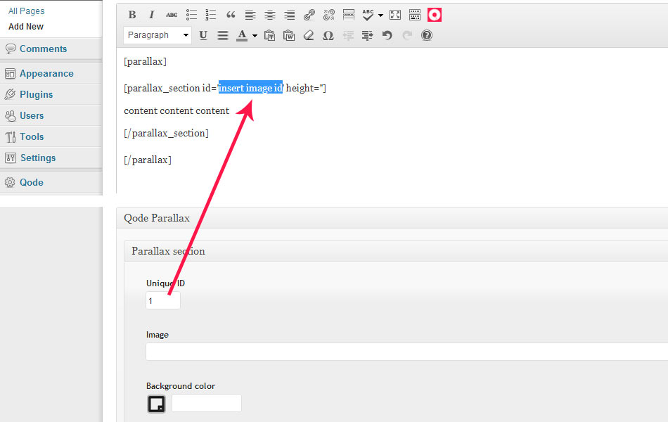 Step 2. Add a new parallax section in the “Qode Parallax” below the editor and “Qode Sliders”. Note that like with sliders, the Unique ID must be exactly the same value as in the shortcode (example: [parallax_section id='1']. Images must be higher than parallax section height in order to avoid blank space between sections.