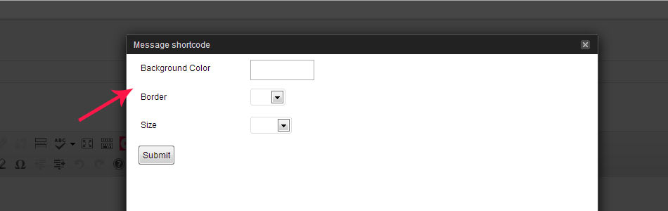 Simpler shortcodes will appear directly in the editor once clicked. More complex shortcodes will display a pop-up window with additional options, different for each shortcode. Change attributes to customize the shortcode before submitting.