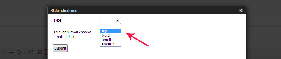 Step 1. Insert a slider into a page by adding the shortcode from the dropdown menu. Choose between 4 types of sliders in the pop-up window.