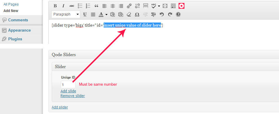Step 2. Click the “Add Slider” button in the Qode Sliders section below the Editor. This will display “Unique ID” which has to be inserted in the shortcode ID attribute between apostrophes ‘’ (example: [slider type='big1' title='' id='1']