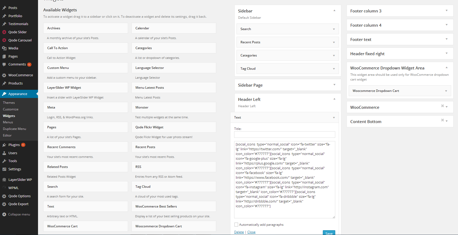 Access the “Qode Options” in the left menu. Some of these options may be overridden locally, in the shortcode or page settings (e.g. text color in editor or page title layout in the Qode Custom Fields while editing post/page/portfolio item).